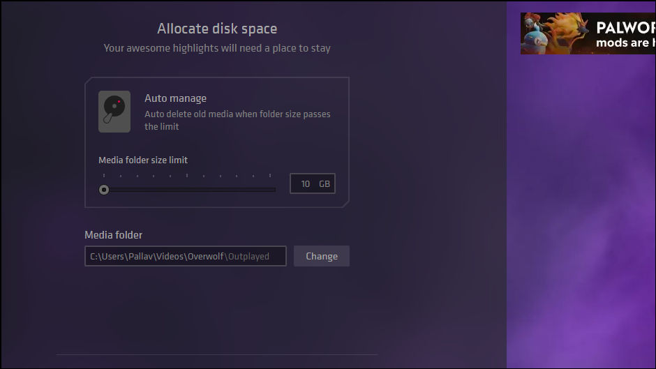 - Use the slider to control how much space to provide the app for storing highlights. When this limit is reached, Outplayed will automatically delete old recordings.