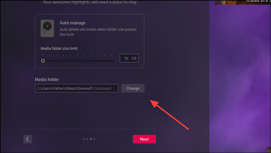 - Moving to the next page, here you will be able to determine where the highlights recorded by the app are stored and how much space to allocate for that.
