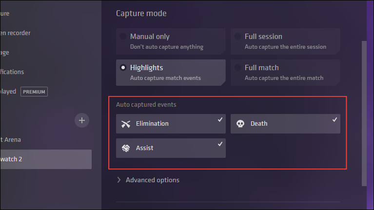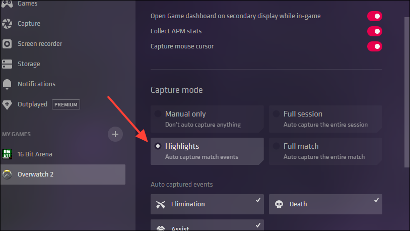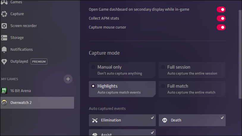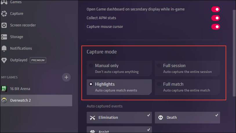 - With the 'Highlights' option selected, the app will automatically capture events like Death, Assist, and Elimination, depending on the game. These are visible in the 'Auto-Captured Events' and can be turned on or off by a mouse click.