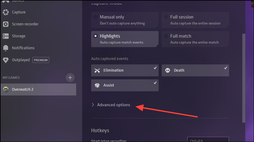- With the game selected, you will see all related settings, such as those related to the capture mode. Click the 'Advanced Options' button below that.