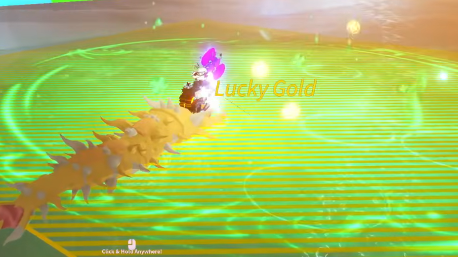 The Golden Rainbow Leviathan is fished directly inside the Golden Lucky Rainbow area rather than the Lucky Gold Pool. It accepts Gold Coin as bait in addition to Lucky and Clover Cluster, giving you a slight edge if you've been collecting coins from the pot of gold.
