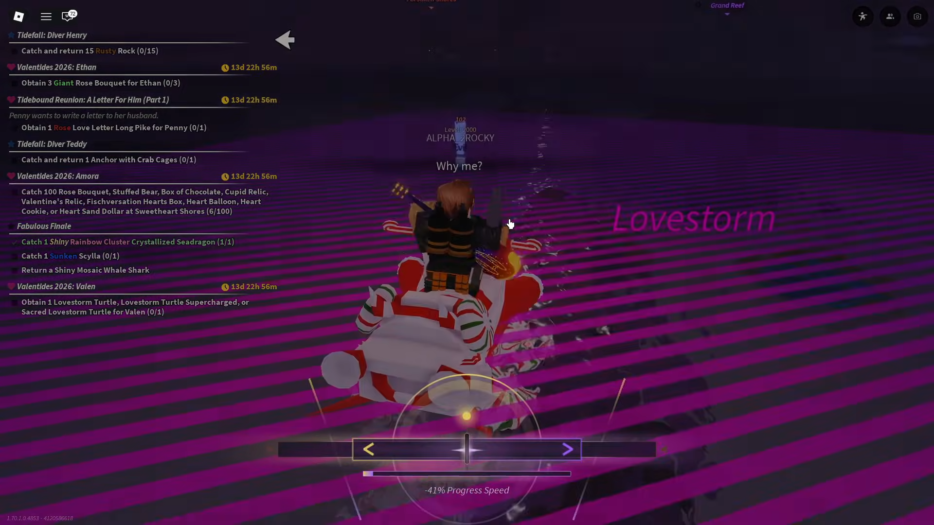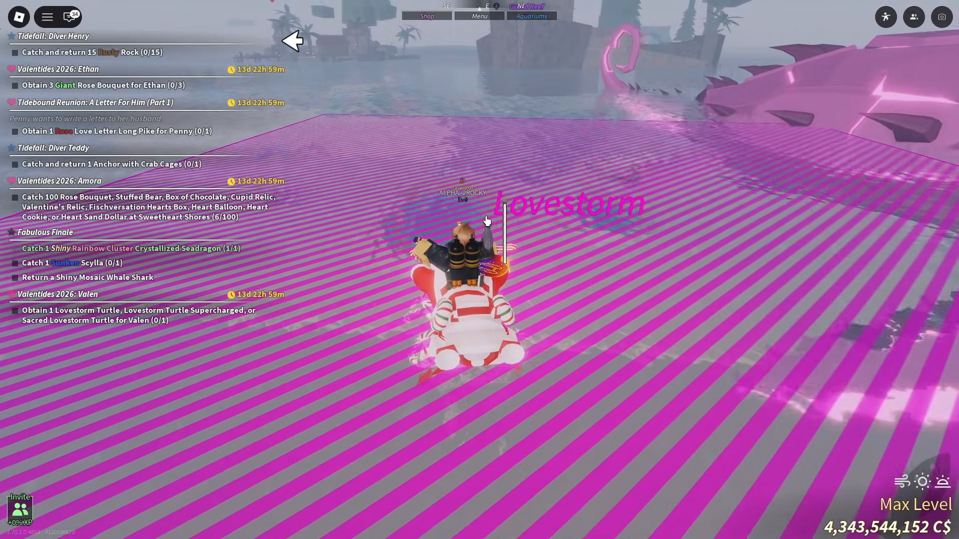 Cast your line anywhere within the purple Lovestorm pool. The fishing minigame follows standard Fisch mechanics: watch for the bobber to dip, then reel in while managing the shake prompts. High-resilience rods reduce the difficulty of landing the catch, but luck determines whether you hook the Lovestorm Turtle instead of common fish.