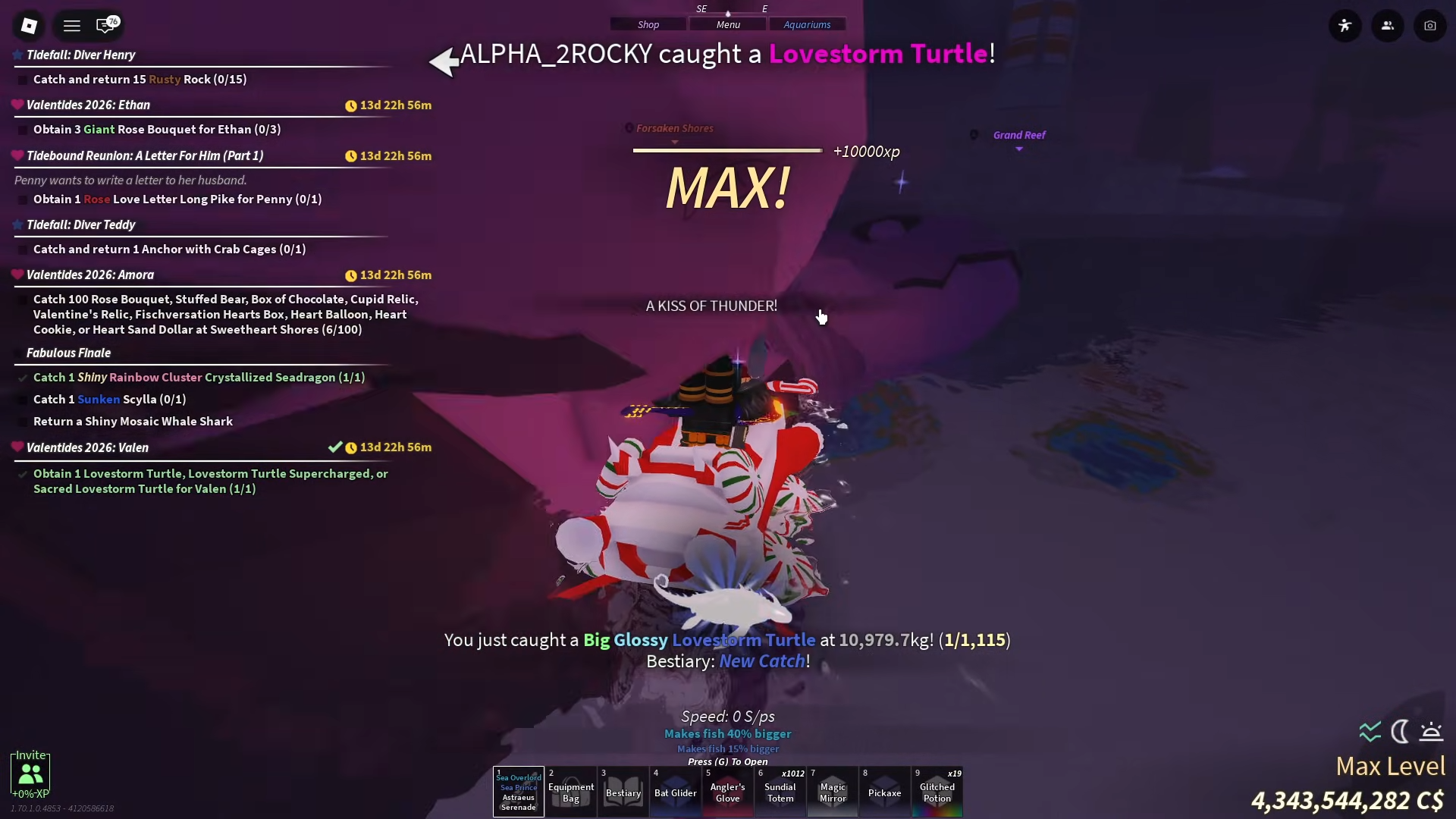 When you successfully catch the Lovestorm Turtle, a large notification appears on screen with your username and "+15000xp". The purple and pink turtle model briefly surfaces before being added to your inventory. The hunt ends immediately for all players in the server once someone catches the turtle, so speed matters if multiple players are fishing simultaneously.