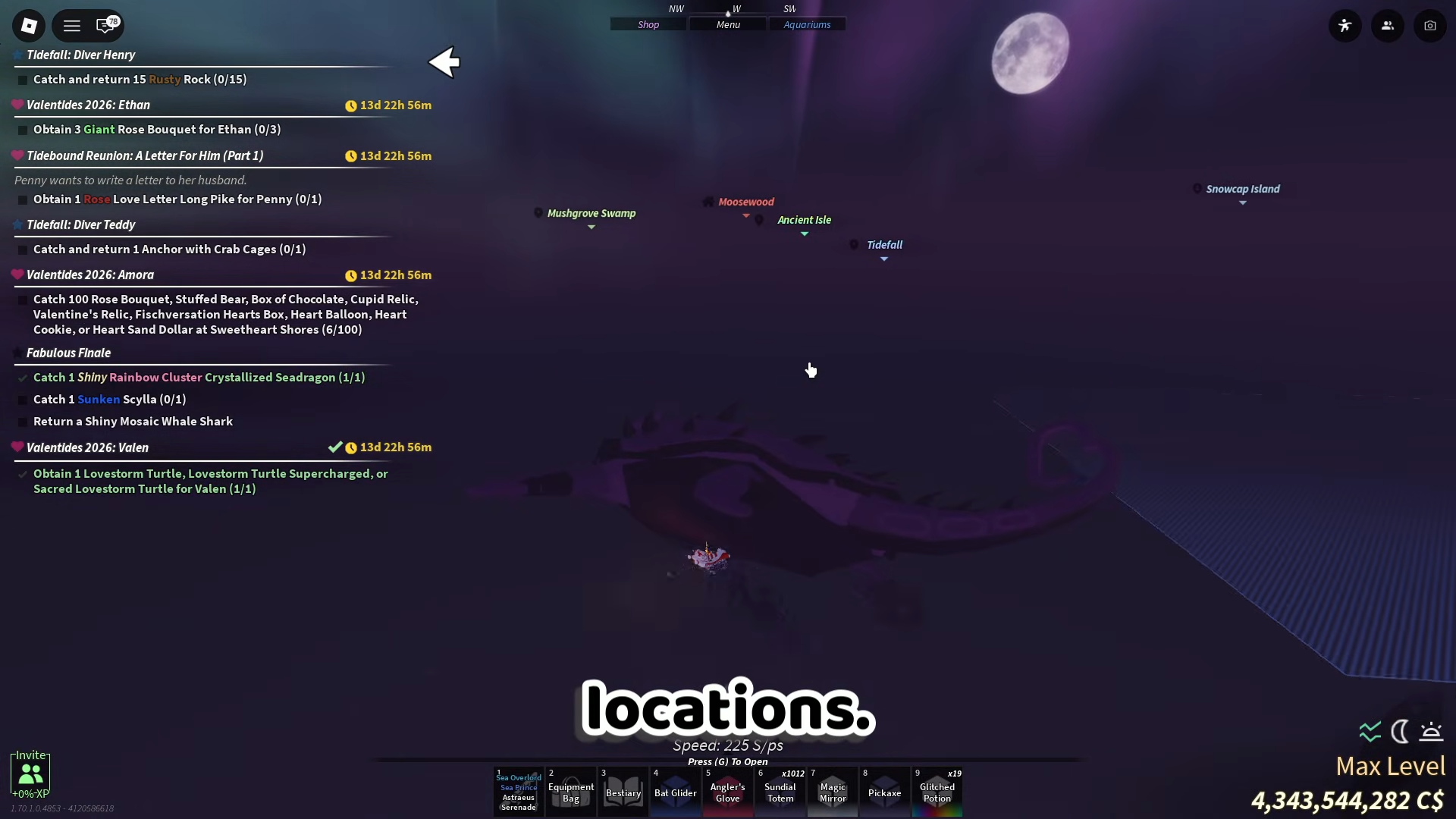 The pool's exact position varies slightly between spawns but always appears in the ocean area between Moosewood and Roslit Bay. Enable your radar to help locate the zone if visibility is poor. Once inside the purple boundary, you can begin fishing immediately.