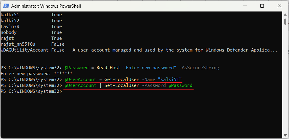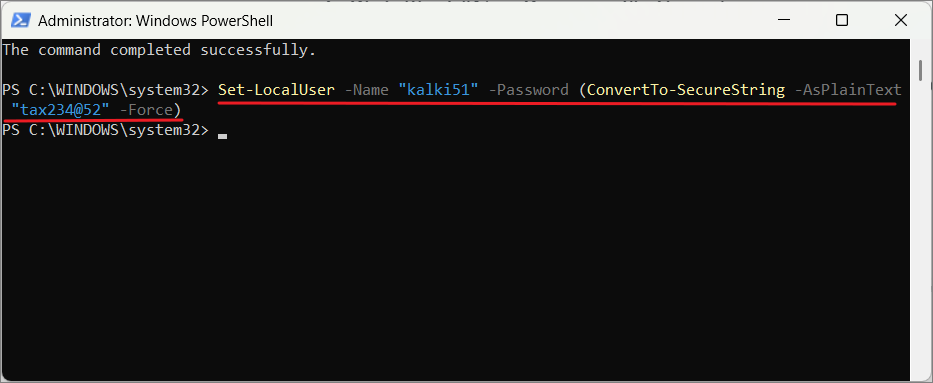Set-LocalUser -Name "kalki51" -Password (ConvertTo-SecureString -AsPlainText "tax234@52" -Force)