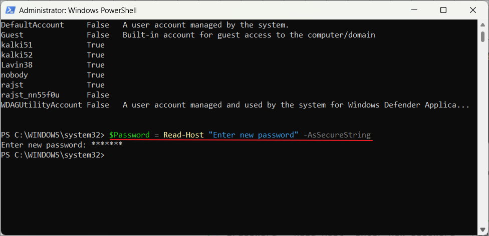 $Password = Read-Host "Enter new password" -AsSecureStringType your new password when prompted and press Enter. The password you enter will be converted into a secure string.