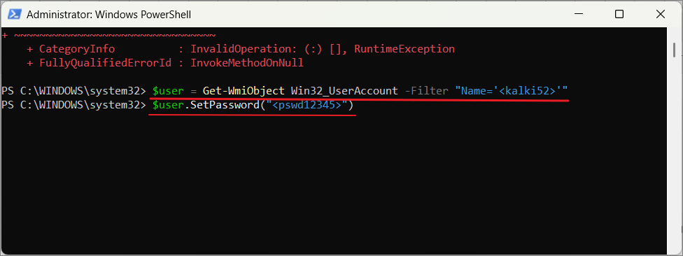 $UserAccount = Get-LocalUser -Name "Username"Step 5: Set the new password for the user account using this command:
