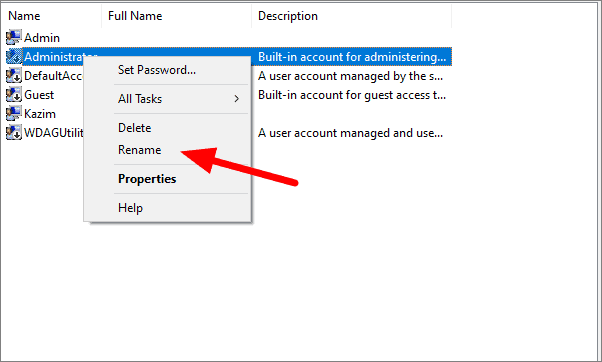 You will see the list of all the users in this section. To change the administrator name, right-click on ‘Administrator’ and then click on ‘Rename’.