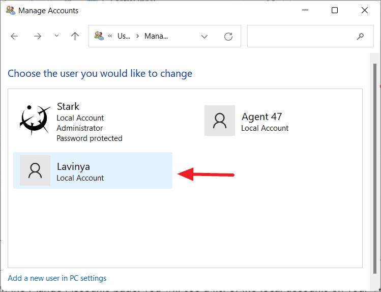 Step 3: On the Manage Accounts page, you'll see a list of all local accounts on your computer. Click on the user account you want to modify.