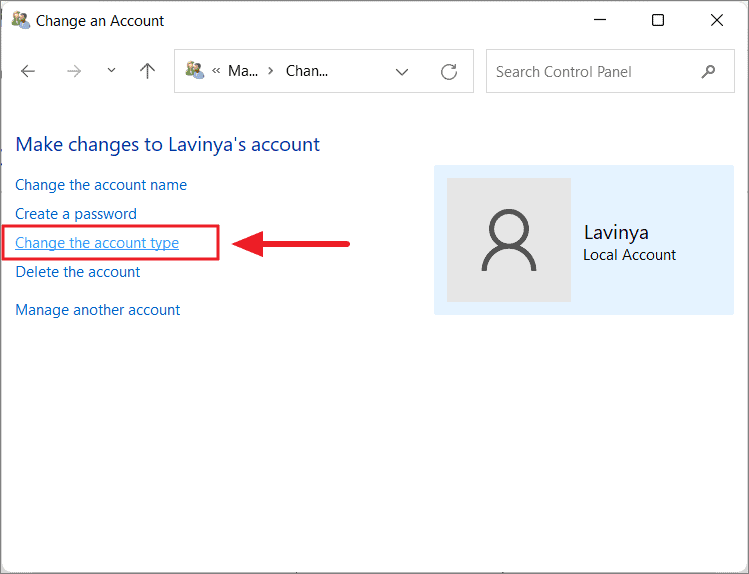 Step 4: Click on Change the account type from the options available.