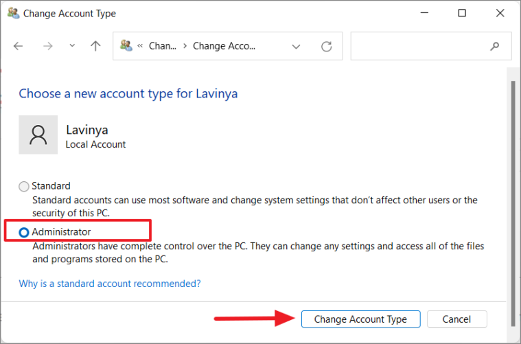Step 5: Select the Administrator option and click on Change Account Type to confirm the changes.