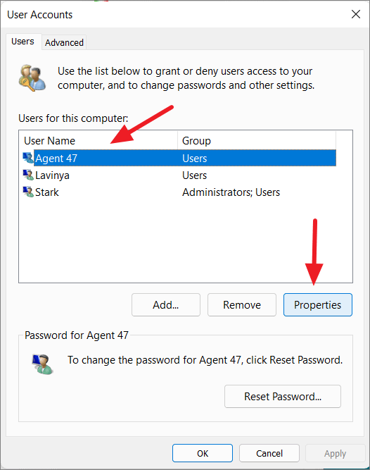 Step 2: In the User Accounts window under the Users tab, select the user account you want to modify. Then, click on the Properties button.
