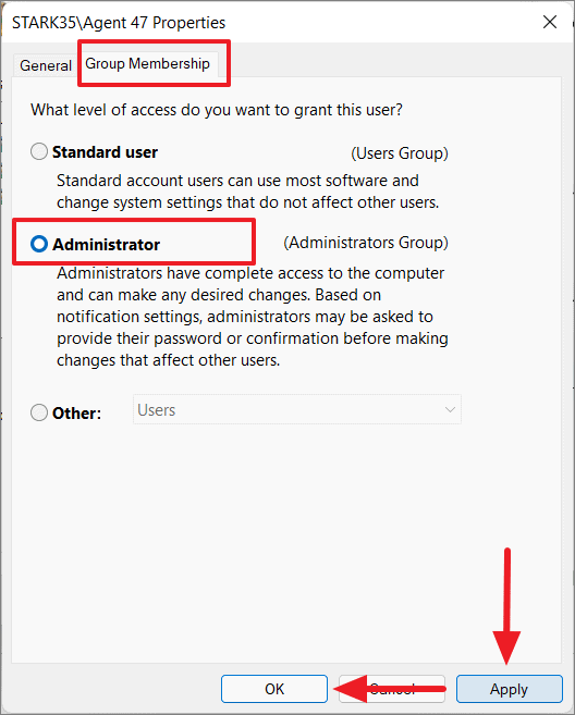Step 3: Navigate to the Group Membership tab. Choose the Administrator option. Click Apply and then OK to save the changes.