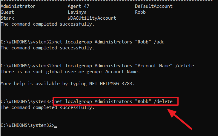 The account has now been granted administrator privileges. To remove an account from the Administrators group and revert it to a standard user, use the following command: