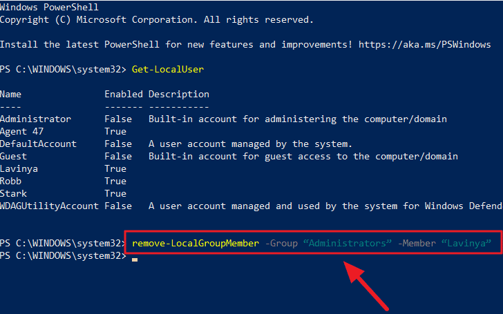 Step 4: To remove a user from the Administrators group and revert them to a standard user, use the following command: