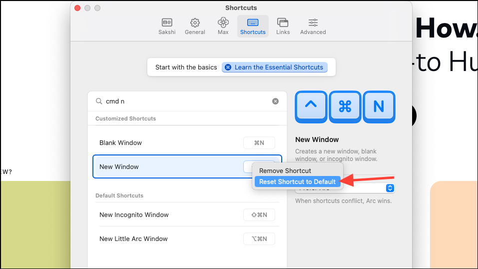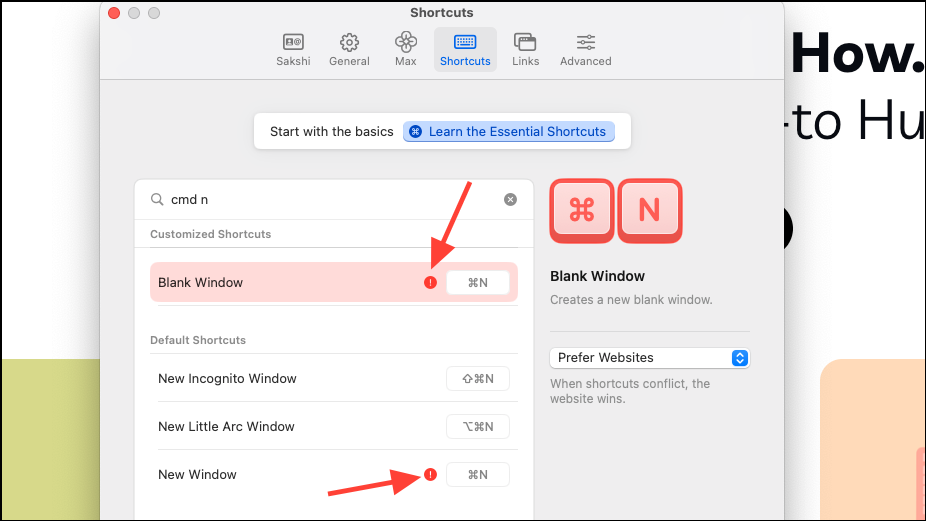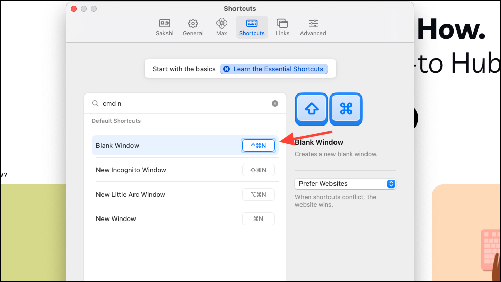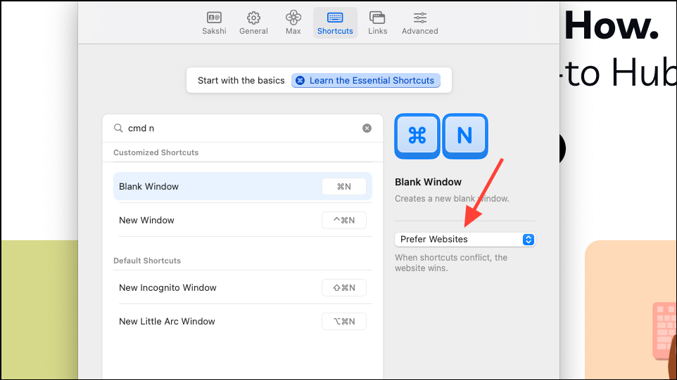 - Choose to Prefer Website/ Arc: There are times when a website wants to use the same keyboard shortcut as the one that Arc Browser uses. In these cases, you can set your preference about which action you'd like to take priority. This has to be set for each shortcut individually, unfortunately.