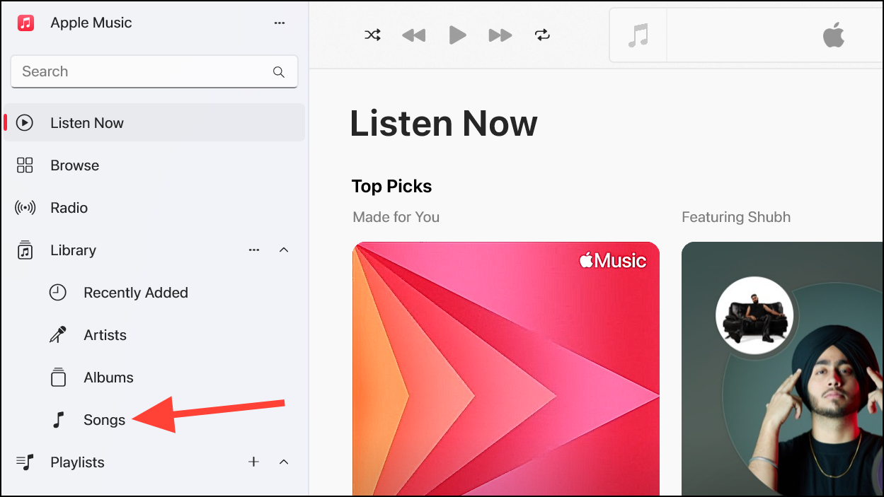 - Then, go to 'Songs' from the sidebar of the Apple Music app.