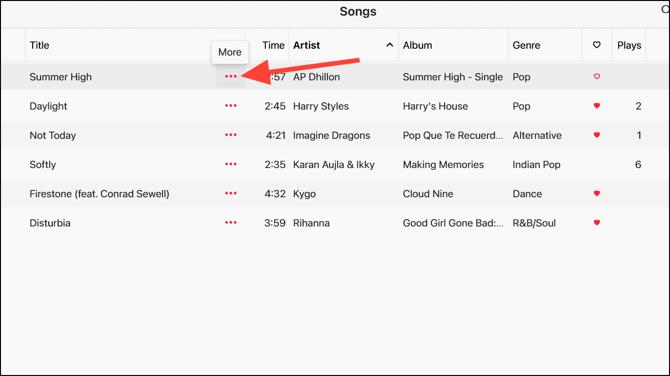 - The songs or music videos that are in your downloads or library will appear. Go to the song that you want to change the artwork for and click the 'More' (...) button.