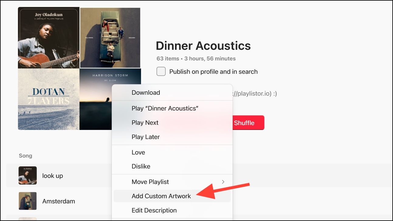 For playlists, Apple Music generally combines the cover image for the first four songs into a collage, or the cover image for the first song (for playlists less than 4 items), as the artwork. To change the artwork for a playlist, follow these steps: