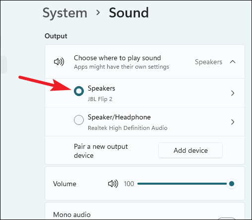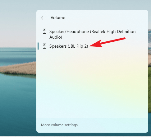If you're unable to access the audio switcher from the taskbar, you can also change the audio output device through the Settings app: