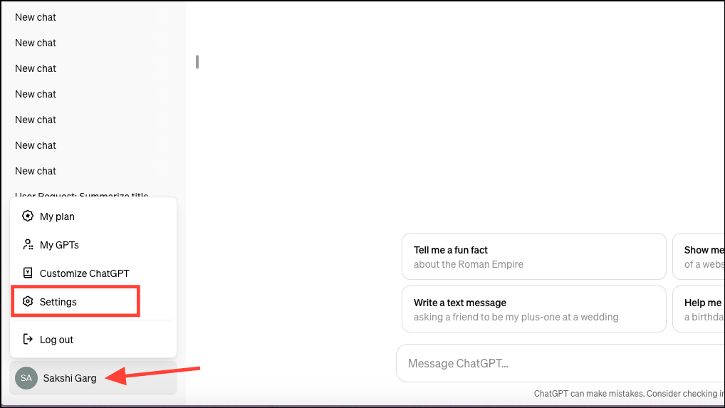 - Then, click your name at the bottom of the sidebar and select 'Settings' from the flyout menu.