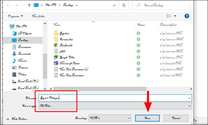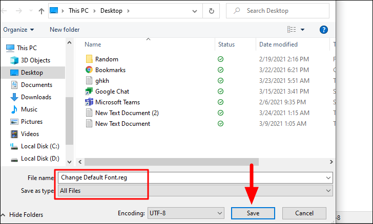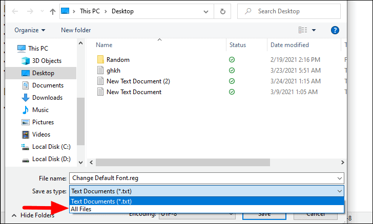In the ‘Save as’ window, enter a name for the file and then add the ‘.reg’ extension at the end. Also, change the file type to ‘All files’ just as you did earlier, and then click on ‘Save’ at the bottom-right corner.