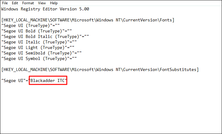 Now, replace the “NEW-FONT-NAME” in the last of the code with the one you chose earlier. In this case, it’s ‘Blackadder ITC’.