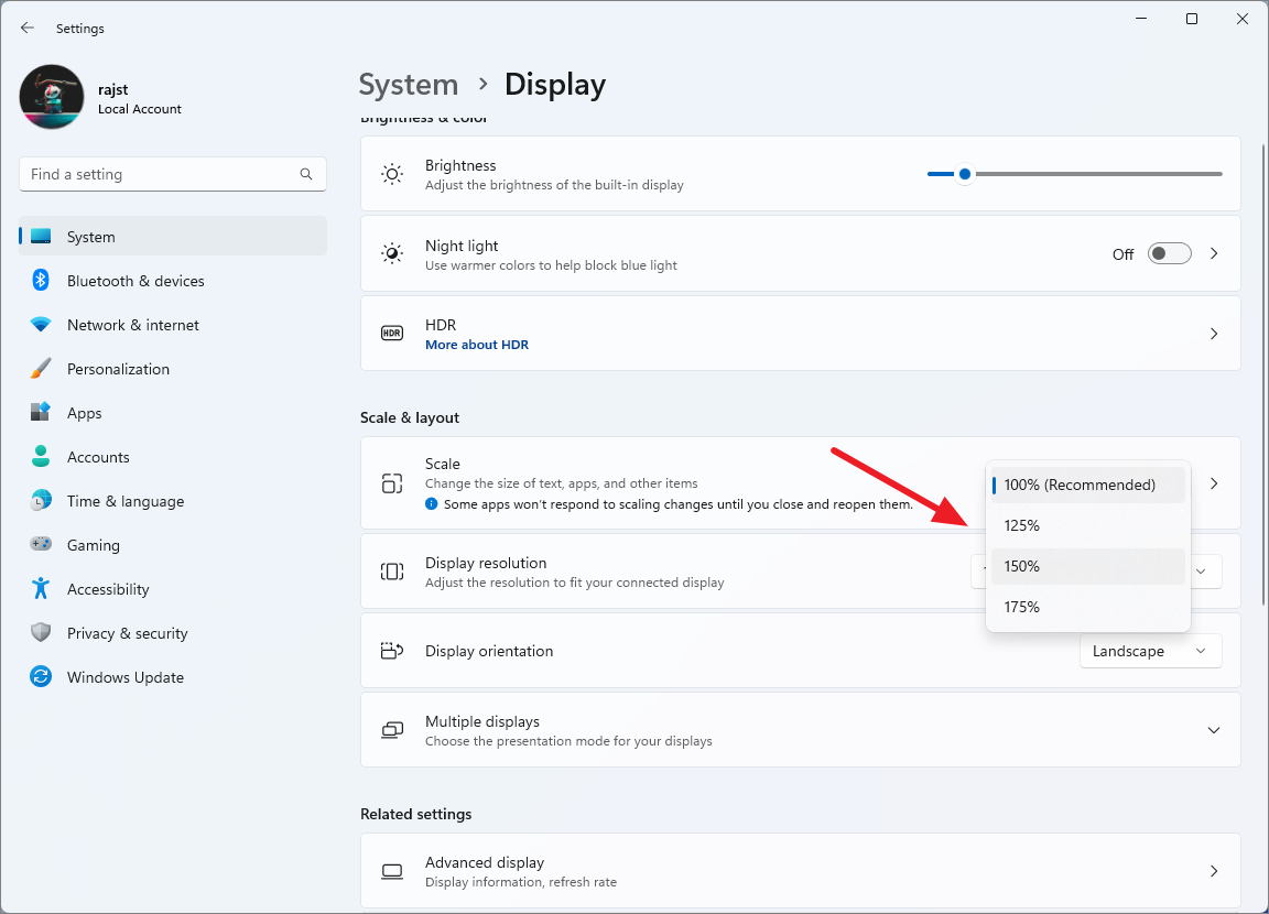 Step 3: In the Display settings, scroll down to the 'Scale & layout' section. Click on the dropdown menu next to 'Scale.'