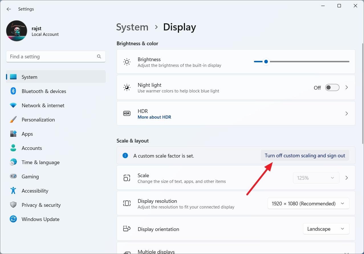 Step 2: Under the 'Scale & layout' section, click on 'Turn off custom scaling and sign out.'
