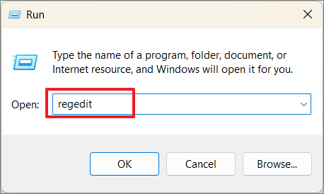 Step 1: Press Windows+R to open the Run dialog box, type regedit, and press Enter to launch the Registry Editor.
