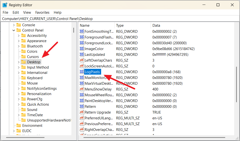 HKEY_CURRENT_USER\Control Panel\DesktopStep 3: Look for the entry named 'LogPixels' in the right pane. If it doesn't exist, right-click in the right pane, select 'New' > 'DWORD (32-bit) Value', name it LogPixels, and press Enter.