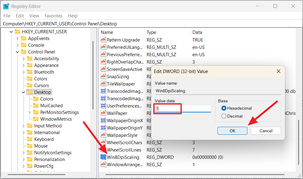 Step 6: Double-click on Win8DpiScaling and set the value data to 1 to enable custom scaling or 0 to disable it. Click 'OK.'