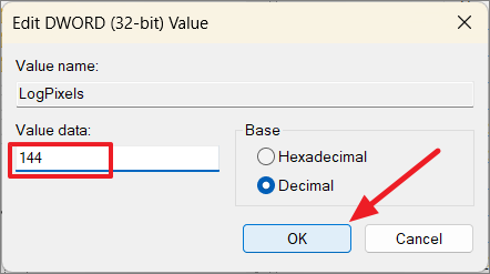Step 4: Double-click on LogPixels. Set the Base to 'Decimal', enter one of the following values corresponding to your desired DPI scale, and click 'OK.'