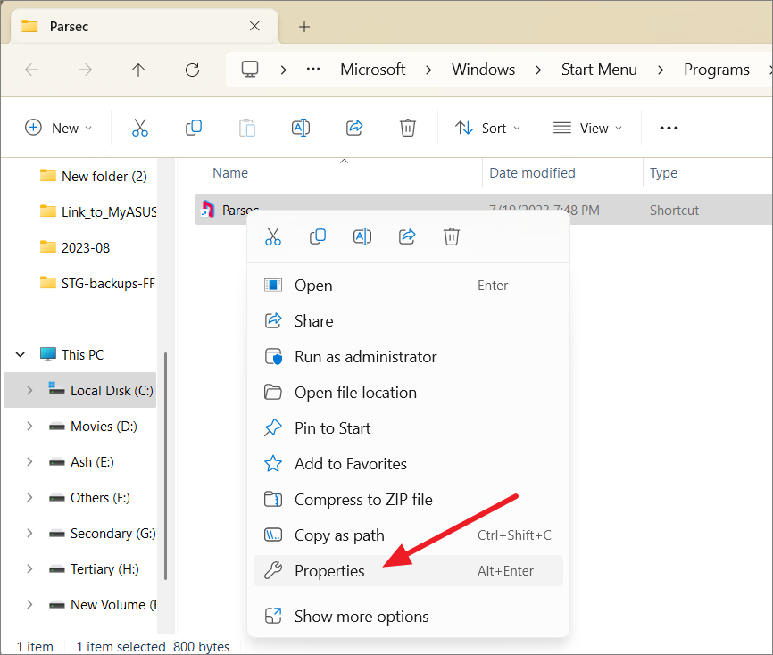 Step 2: In the file location, right-click on the application's executable file and select 'Properties.'