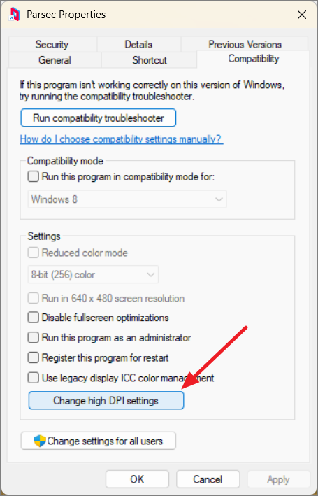 Step 3: Navigate to the 'Compatibility' tab and click on 'Change high DPI settings.'