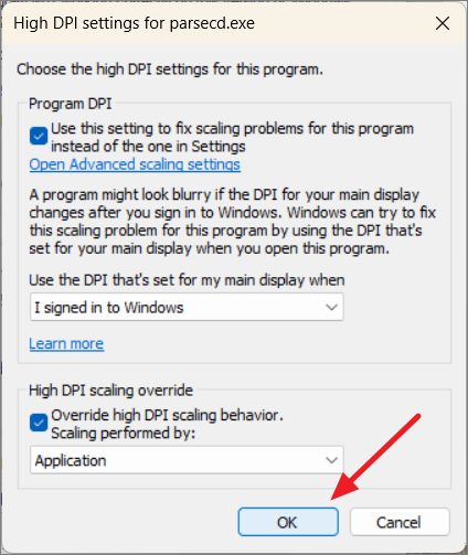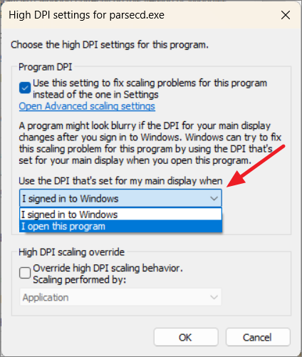 Step 5: Choose when to apply the DPI: either when you sign in to Windows or when you open the program. If issues persist, try selecting 'I open this program.'