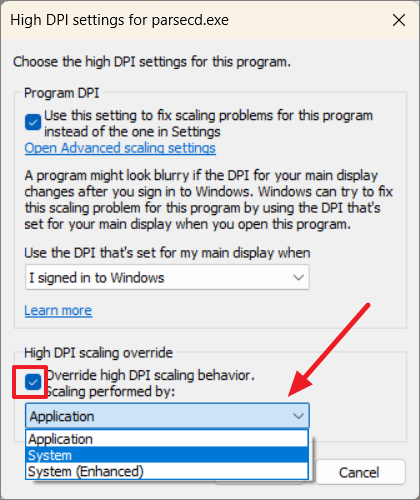 Step 6: Under 'High DPI scaling override,' check the box for 'Override high DPI scaling behavior.' From the dropdown menu, select how scaling should be performed: