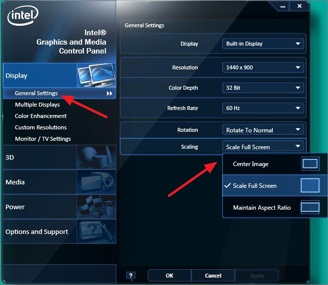 Step 2: In the Intel Graphics Control Panel, go to the 'General Settings' tab. Under 'Scaling,' select your preferred scaling mode: Maintain Display Scaling, Maintain Aspect Ratio, Scale Full Screen, or Center Image.