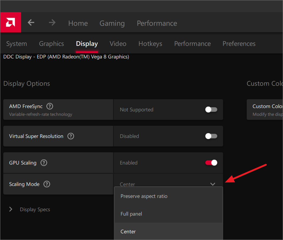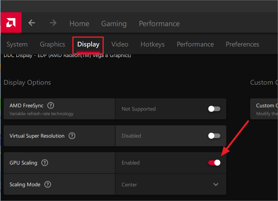 Step 4: Go to the 'Display' tab and toggle on 'GPU Scaling.'