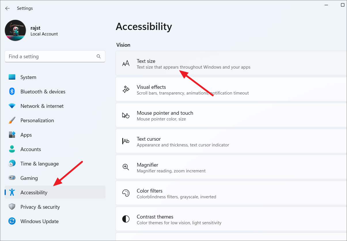Step 2: In the Settings app, choose 'Accessibility' from the left-hand menu, then click on 'Text size.'