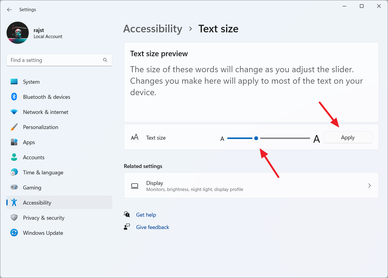 Step 3: Use the slider under 'Text size' to increase or decrease the font size. A preview is displayed to show you how the text will look. Once you've chosen your desired size, click 'Apply.'