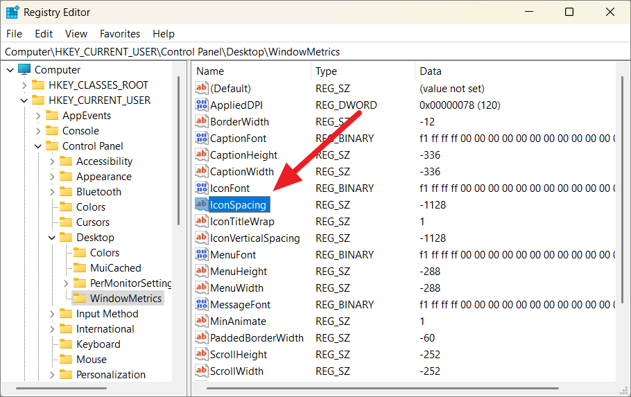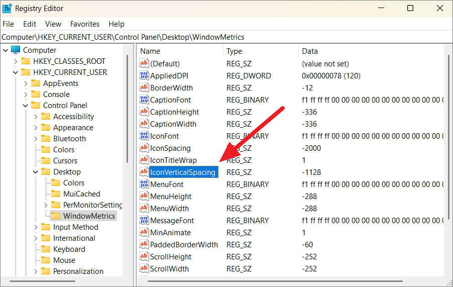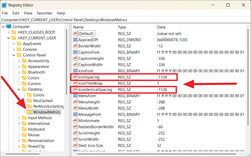 Step 3: In the 'WindowMetrics' folder, find the entries named 'IconSpacing' and 'IconVerticalSpacing' on the right pane.