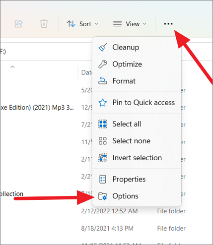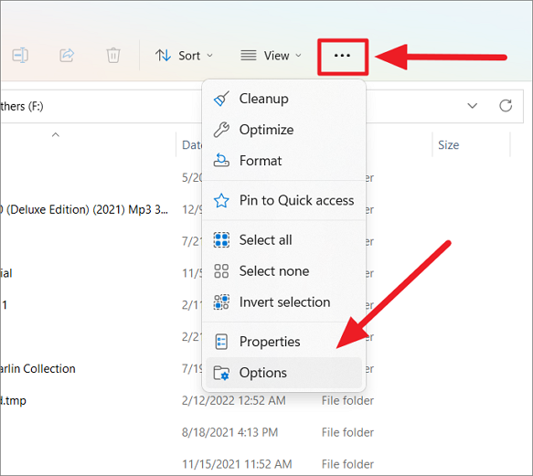 Step 1: In File Explorer, click on the 'See more' button (three dots) and select 'Options'.