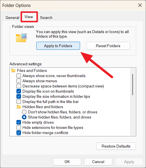 Step 5: In the 'Folder Options' window, switch to the 'View' tab and click on 'Apply to Folders'. A confirmation dialog will appear.
