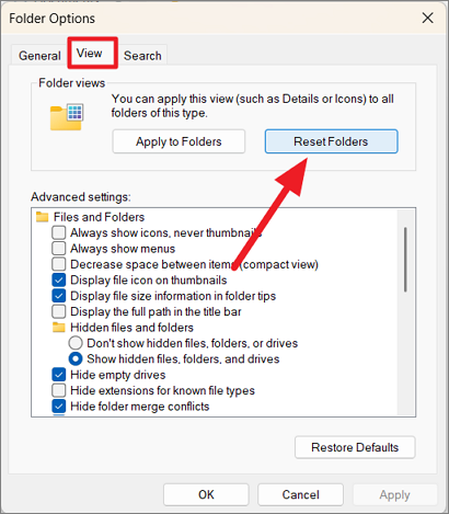 Step 2: Go to the 'View' tab in 'Folder Options' and click 'Reset Folders'.