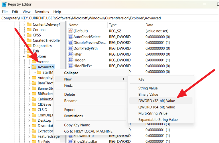 HKEY_CURRENT_USER\Software\Microsoft\Windows\CurrentVersion\Explorer\AdvancedStep 3: Right-click on the 'Advanced' folder in the left pane, select 'New', then choose 'DWORD (32-bit) Value'. Name the new value TaskbarSi.