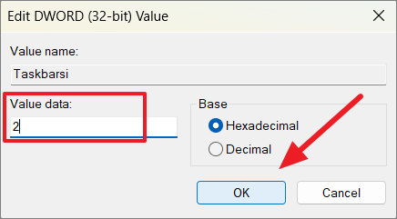 Step 4: Double-click on 'TaskbarSi' and set its 'Value data' to one of the following: