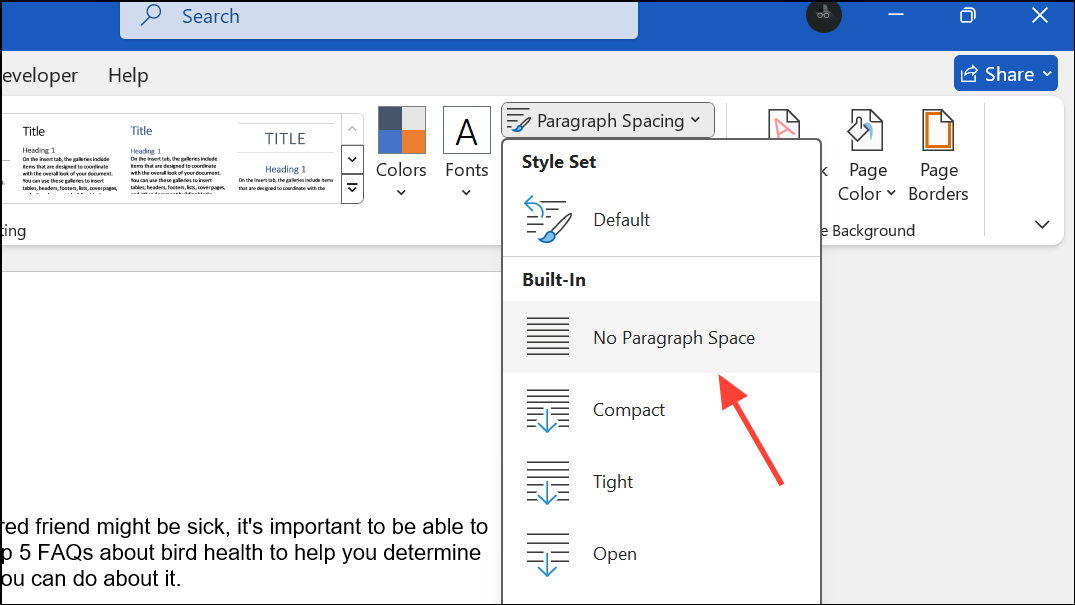 Step 4: If you want to restore the original spacing settings later, return to Design > Paragraph Spacing and choose the default or current style set listed under Style Set.