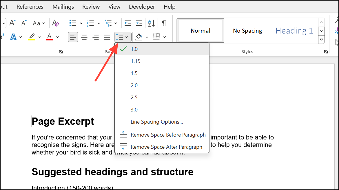 Step 3: Click the Line and Paragraph Spacing button to see a dropdown menu with common spacing options (such as 1.0, 1.15, 1.5, 2.0).