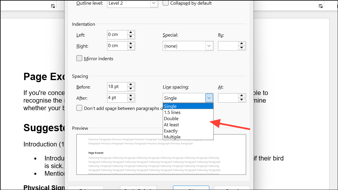 Step 4: To customize the spacing, select Line Spacing Options from the dropdown. In the dialog box that appears, you can set precise values for Line spacing (such as Single, 1.5 lines, Double, or Exactly) and adjust Spacing Before and After to control the space above or below each paragraph.